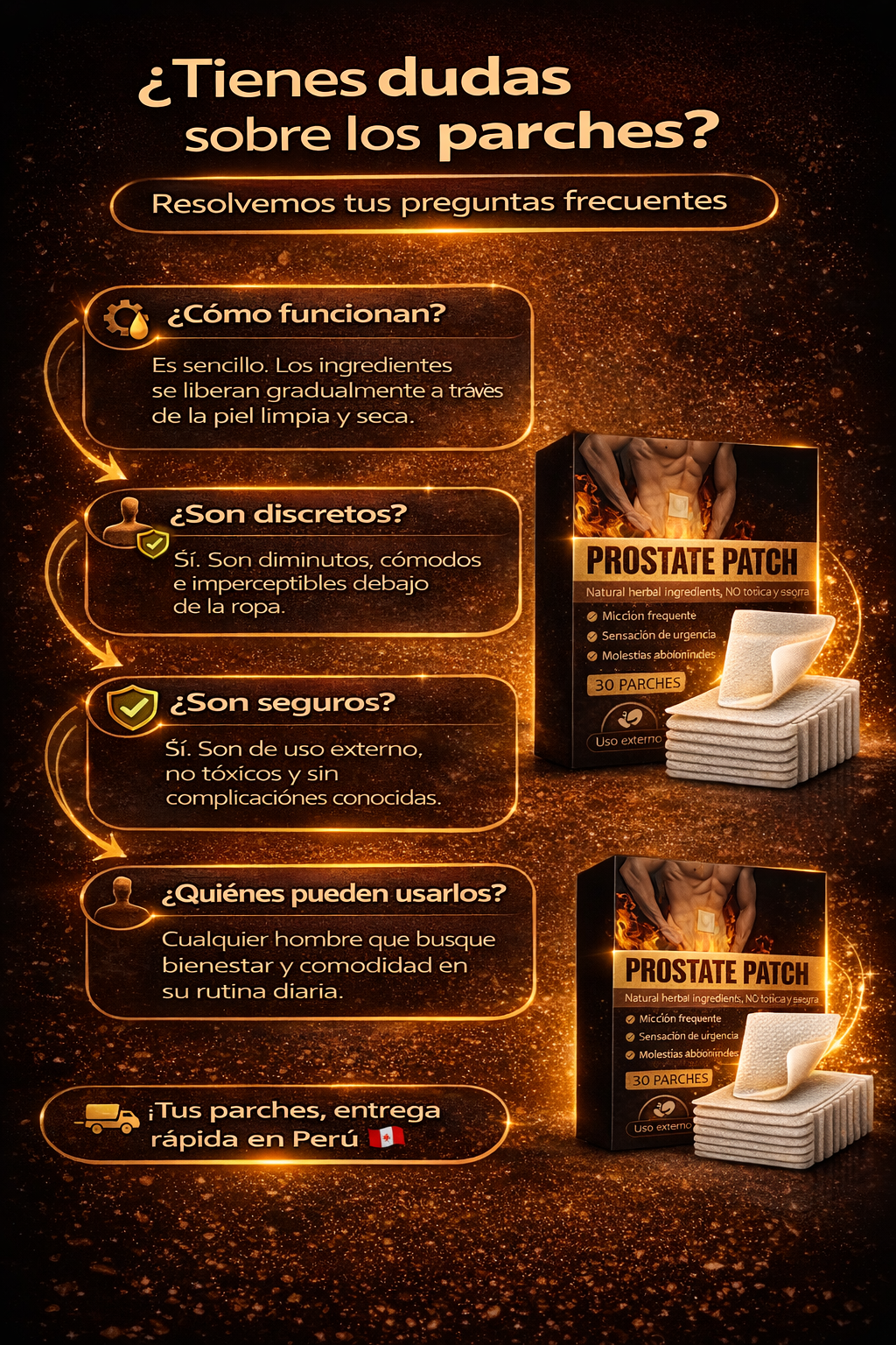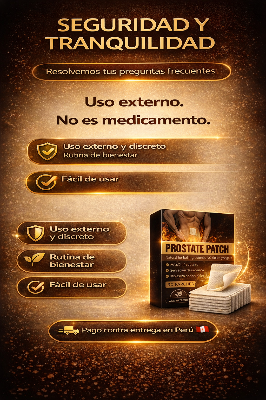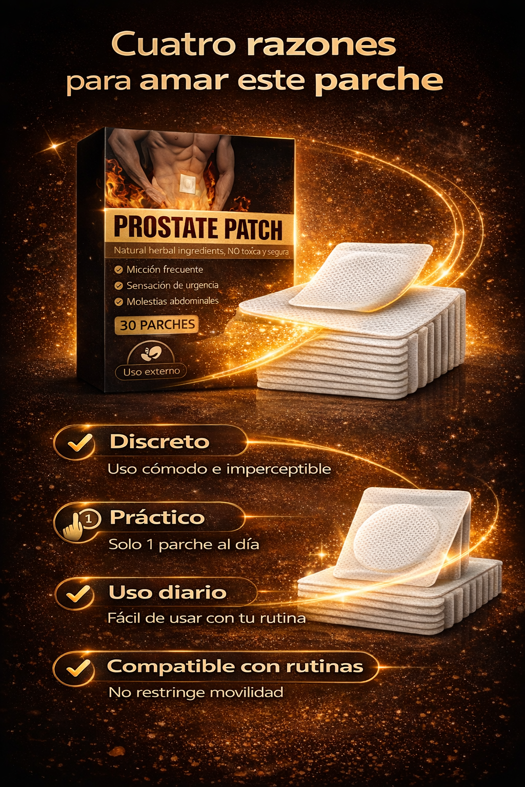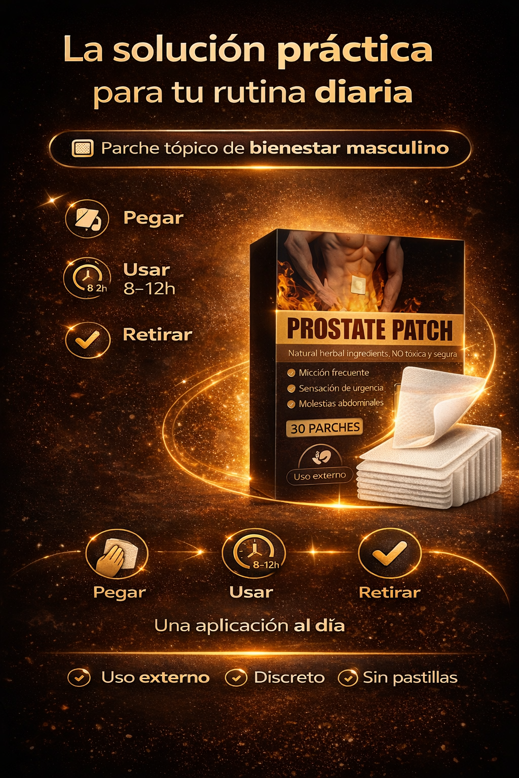 Tecnología Transdérmica para el Bienestar Masculino PROSTATE PATCH es un innovador parche de bienestar diseñado específicamente para la anatomía masculina adulta. A diferencia de los métodos tradicionales, utiliza tecnología de liberación gradual para suministrar ingredientes naturales directamente a través de la piel. Ideal para hombres que buscan mantener una rutina urinaria saludable y un descanso nocturno sin interrupciones, evitando la sobrecarga digestiva. Cada caja contiene un tratamiento para 30 días. Discreto, higiénico y fácil de aplicar.